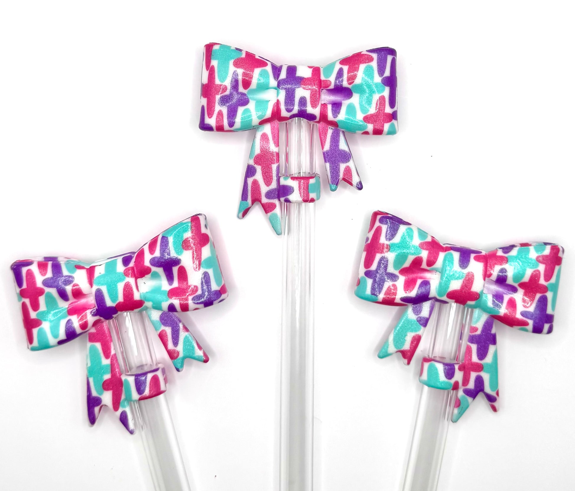 Brush stroke cross print big bow silicone straw topper (HBK exclusive)